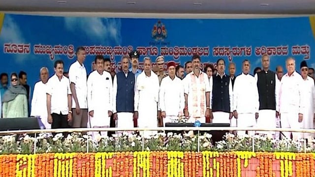 Karnataka Cabinet Oath Ceremony : काँग्रेसचे नेते सिद्धरामय्या यांनी कर्नाटच्या मुख्यमंत्री पदाची दुसऱ्यांदा शपथ घेतली. तर कर्नाटक काँग्रेसचे प्रदेश अध्यक्ष डी. के. शिवकुमार यांनी उपमुख्यमंत्री पदाची शपथ घेतली. यांच्यासह आठ आमदारांनी मंत्रीपदाची शपथ घेतली. यामध्ये काँग्रेसने जातीय समीकरणही राखले आहे.