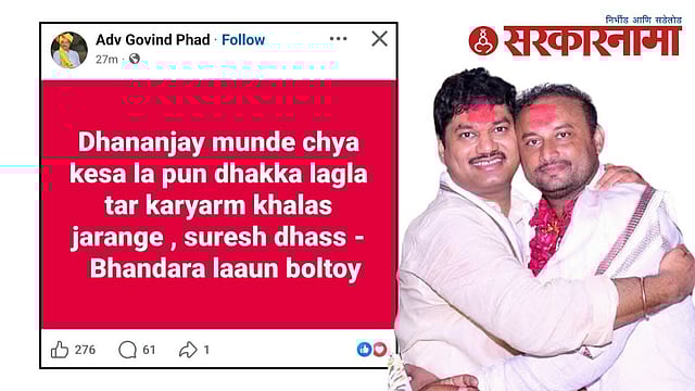 बीडमधील आमदार धनंजय मुंडे (Dhananjay Munde) यांचे कट्टर समर्थक गोविंद फड याने फेसबुकवर पोस्ट करत, धनंजय मुंडे यांच्या केसाला पण धक्का लागला, तर मनोज जरांगे आणि सुरेश धस यांचा खेळ खल्लास, असे म्हटले आहे. हे भंडारा लावून बोलतोय, असेही या पोस्टमध्ये म्हटल्याने खळबळ उडाली आहे.