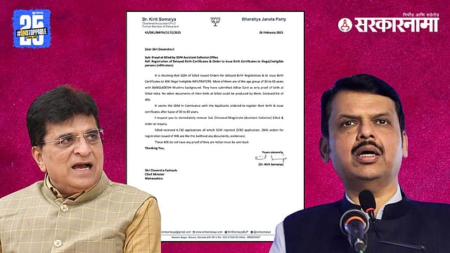 BJP Politics : भाजपाचे नेते माजी खासदार किरीट सोमय्या यांनी सिल्लोड दौऱ्याहून परतताच 'एसडीएम'खान यांची तक्रार थेट मुख्यमंत्री देवेंद्र फडणवीस यांच्याकडे केली आहे. खान यांनी सिल्लोडमधील 406 अशा लोकांना जन्म प्रमाणपत्र दिले आहे, ज्यांचा जन्म सिल्लोड किंवा भारतात झाल्याचा एकही पुरावा नाही, असा दावा सोमय्या यांनी केला. या संपूर्ण प्रकरणाची चौकशी करावी आणि उपविभागीय अधिकारी खान यांची हकालपट्टी करावी, अशी मागणी किरीट सोमय्या यांनी मुख्यमंत्र्यांना पाठवलेल्या पत्रात केली आहे.