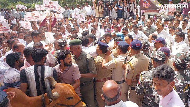 Gokul Protest News : डिबेंचर रक्कम परत करावी, या मागणीसाठी 'गोकुळ'च्या कार्यालयावर काढलेल्या मोर्चाला हिंसक वळण लागले. पोलिस आणि आंदोलकांमध्ये हाणामारी झाली. मोर्चात आणलेली जनावरे आतमध्ये सोडणार नाहीत, अशी भूमिका पोलिसांनी घेतली. तर, जनावरे आतमध्ये घेऊन जाण्यासाठी आंदोलक देखील आक्रमक झाले. अखेर संतप्त आंदोलकांनी गेट तोडून आतमध्ये प्रवेश केला. त्यामुळे पोलिसांची तारांबळ उडाली. आंदोलकांच्या आक्रमक पवित्र्यामुळे तणावाचे वातावरण निर्माण झाले होते.