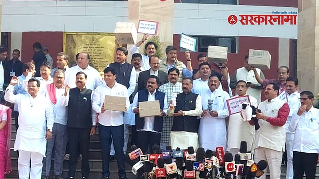 विधिमंडळ अधिवेशनाच्या दुसऱ्या आठवड्यातील कामकाज सुरु झालं आहे. आजही विरोधकांनी विधानभवनाच्या पायऱ्यांवर जोरदार घोषणाबाजी करत सत्ताधाऱ्यांविरोधात आक्रमक पवित्रा घेतला. "हकालपट्टी करा, हकालपट्टी करा.. भ्रष्ट मंत्र्यांची हकालपट्टी करा", "शेतकऱ्यांना धोका, मंत्र्यांना खोका", "विदर्भाला धोका, मंत्र्यांना खोका", "महाराष्ट्राला धोका... मंत्र्यांना खोका", "शेतकरी हैराण, सरकार खातो गायरान", "सीमावासी हैराण.. सरकार खातो गायरान" अशा घोषणांनी विरोधकांनी विधानभवन परिसर दणाणून सोडला.