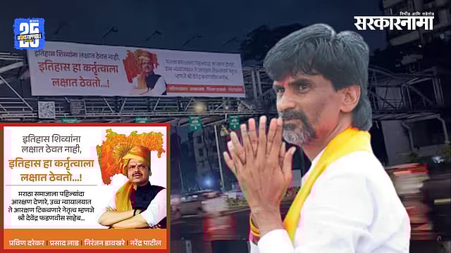 या बॅनरबाजीतून त्यांनी मनोज जरांगेंना आव्हान दिल्याचं दिसत आहे. जरांगेंच्या मोर्चाला प्रत्युत्तर आणि मुख्यमंत्री देवेंद्र फडणवीसांच्या समर्थनार्थ लावण्यात आलेल्या बॅनरवर 'इतिहास शिव्यांना नव्हे तर इतिहास हा कर्तृत्ववाला लक्षात ठेवतो'; असं लिहिलं आहे. शिवाय मराठा समाजाला पहिल्यांदा आरक्षण देणारे देवेंद्र फडणवीसच होते, असाही उल्लेख बॅनवर करण्यात आला आहे.