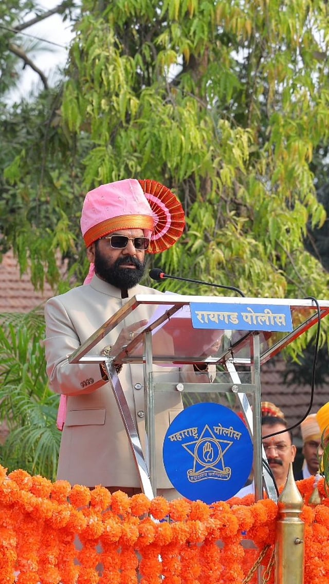 यावेळी मंत्री भरत गोगावले यांनी फिकट गुलाबी फेटा आणि ऑफ व्हाईट क्रिम कलरचा कोट पेहरावा केला आहे