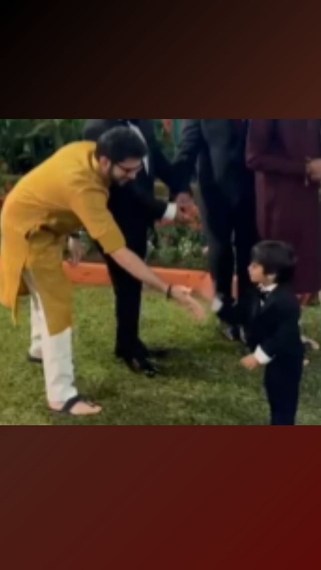 कार्यक्रमात आदित्य ठाकरे आणि अमित ठाकरे यांचा मुलगा किआन यांच्यात मस्त मजा सुरू होती. आदित्य यांनी किआनसमोर हात पुढे केला, पण किआनने हात पुढे करू लागल्यावर त्यांनी खेळकरपणे हात मागे घेतला.