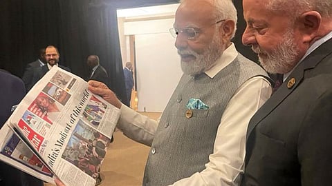हे वृत्त नरेंद्र मोदी वाचत असल्याचा फोटो एस जयशंकर यांनी शेअर केला आहे. 'India's Modi Out Of This World'अशी या वृत्तपत्राची हेडलाईन आहे. या फोटो समाजमाध्यमांवर व्हायरल होत आहे.