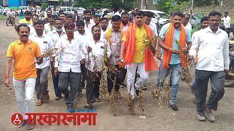त्यानंतर तहसिलदार कार्यालयाच्या प्रवेशद्वारावर नुकसानग्रस्त शेतीपिकांचे तोरण बांधले. यावेळी बोलताना जिल्हाप्रमुख प्रताप जाधव म्हणाले, अतिवृष्टीमुळे शेतकऱ्यांच्या शेतीपिकांचे मोठ्याप्रमाणावर नुकसान झाले आहे. शेतीपिकांच्या नुकसानीमुळे शेतकऱ्यांचे जीवनमान धोक्यात आले आहे.