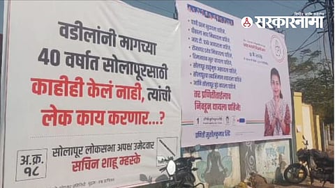 निवडणूक प्रचाराच्या शेवटच्या दिवशी प्रणिती शिंदे यांच्या विरोधात त्यांचे नाव न घेता एका अपक्ष उमेदवाराने बॅनरबाजी केली आहे. अपक्ष उमेदवार सचिन म्हस्के यांनी सोलापुरच्या विविध चौकात शिंदेंच्या विरोधात लावलेले फलक सगळ्याचे लक्ष वेधून घेत आहेत. "वडिलांनी मागच्या 40 वर्षात सोलापूरसाठी काहीही केलं नाही, त्यांची लेक काय करणार.? अशा आशयाचे बॅनर्स झळकले आहेत. तर दुसरीकडे गेल्या दहा वर्षात भाजपच्या दोन्हीही खासदाकांनी सोलापुरचा विकास केला नाही, असा आरोप महाविकास आघाडीच्या उमेदवार प्रणिती शिंदे यांनी केला आहे.