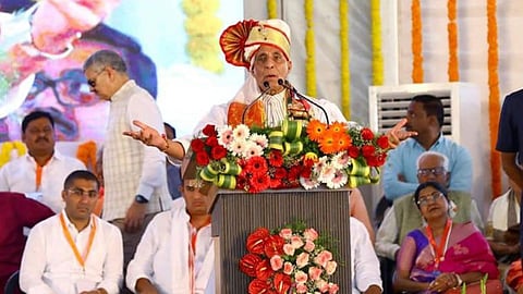 मुंबईत 'इंडिया' आघाडीची दोन दिवसीय बैठक होत असताना राज्यात आलेले केंद्रीय मंत्री राजनाथ सिंह हे विरोधी पक्षांवर काय बोलतात याकडे सर्वांचेच लक्ष होते. हा विषय छेडताना राजनाथ सिंह यांनी मुख्यमंत्री एकनाथ शिंदे (Eknath Shinde) यांच्याकडे पाहत आज मुंबईत होत असलेल्या विरोधी पक्षांच्या 'इंडिया' आघाडीचा उल्लेख केलाच. अगदी मराठीत त्यांनी विरोधकांनी 'इंडिया' नाव घेतल्या बद्दल 'नाव मोठे आणि लक्षण खोटे' अशी टिपण्णी करत विरोधकांच्या एकतेला हा एक पारिवारिक 'कुनबा' असल्याचे संबोधत खिल्ली उडवली.