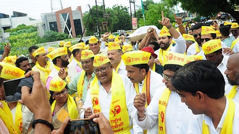 शनिवारी या मागणीला घेत ओबींसीनी (OBC) चंद्रपूर नागपूर महामार्ग रोकून धरला होता. शासनाचा निषेध करण्यासाठी आज पालकमंत्री सुधीर मुनगंटीवार (Sudhir Mungantiwar), हंसराज अहिर, आमदार किशोर जोरगेवार यांच्या घरापर्यंत मुख्यमंत्री व दोन्ही उपमुख्यमंत्र्यांच्या प्रतिकात्मक प्रेतयात्रा काढण्यासाठी जिल्ह्यातून ओबीसी बांधव एकत्र आले होते. सकाळपासूनच या आंदोलनाची जोरदार तयारी सुरू होती. आंदोलनाची गंभीरता लक्षात घेत चोख बंदोबस्त ठेवण्यात आला. जिल्हधिकारी कार्यालयासमोरील आंदोलनस्थळापासून ओबीसी कार्यकर्त्यांनी प्रतिकात्मक प्रेत यात्रा काढली हि प्रेतयात्रा नेत्याच्या घरापर्यंत जाण्यापुवीच पोलिसांनी रोखली. या वेळी पोलीसांनी अनेक कार्यकर्त्याना ताब्यात घेतले.