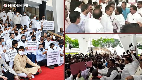 पावसाळी अधिवेशनात गेली चार दिवस खोक्यांच्या घोषणाबाजीवरुन राजकारण तापलं आहे. रोज विरोधक या पायऱ्यावर आंदोलन करीत होत, आज सत्ताधाऱ्यांनी या पायऱ्यांवर आंदोलन करीत आघाडी सरकार, राष्ट्रवादी कॉग्रेसच्या विरोधकात घोषणाबाजी केली.